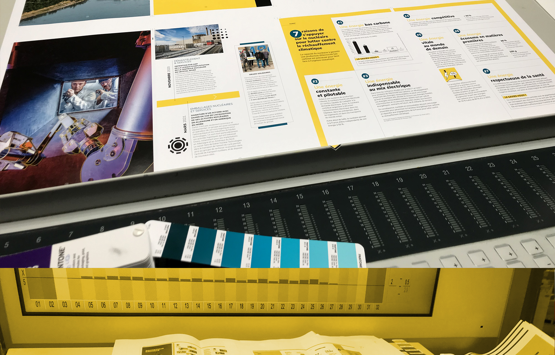 Créa+exé, gabarits, retouches, maquettes, déclinaisons, suivi imprimeur.